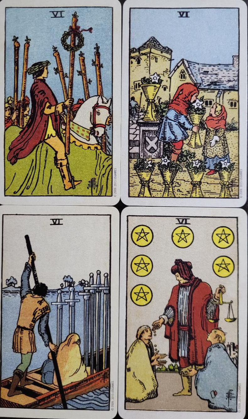 - Six of Swords(소드 6): 다음 단계로 이행함, 유연함, 힘든 시기를 극복함